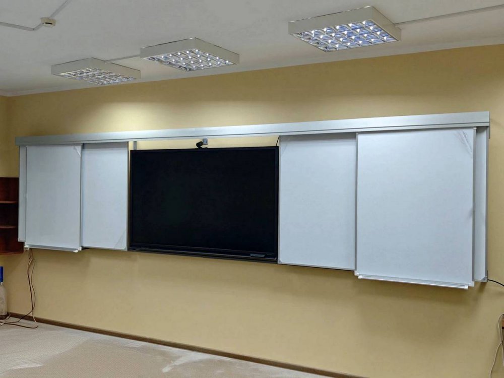 При необходимости преподаватель может закрыть интерактивную систему сдвинув их к центру либо раздвинуть их и работать на интерактивной системе.
