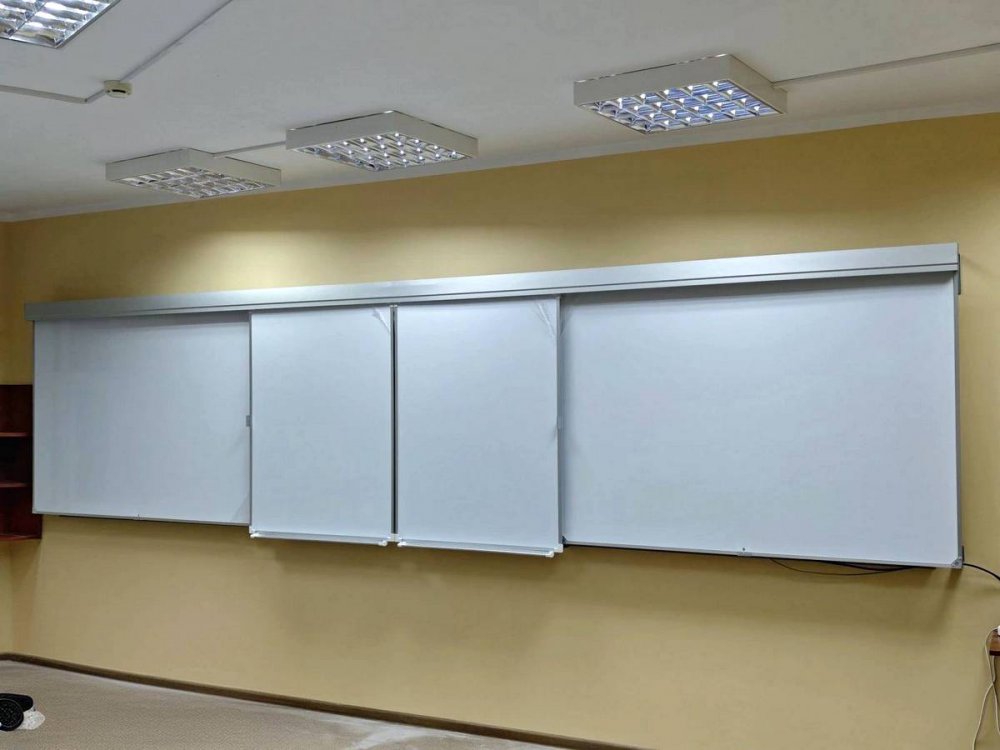 Раздвижная система может быть с разными типами досок: по бокам могут быть меловые, а на рельсах — маркерные доски, и наоборот. Будут учтены все Ваши пожелания!