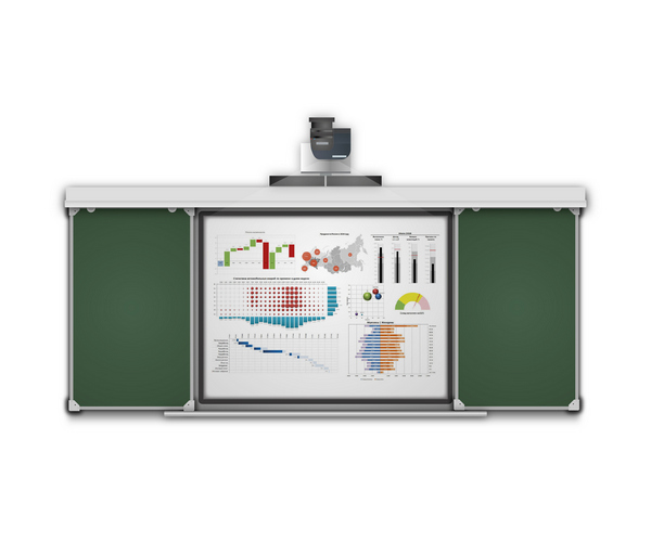 Функционально состоит из 4-х поверхностей (для писания мелом, либо маркером), две из которых свободно перемещаются по рельсовой системе, закрывая интерактивную систему, встроенную в центр рельсовой системы.